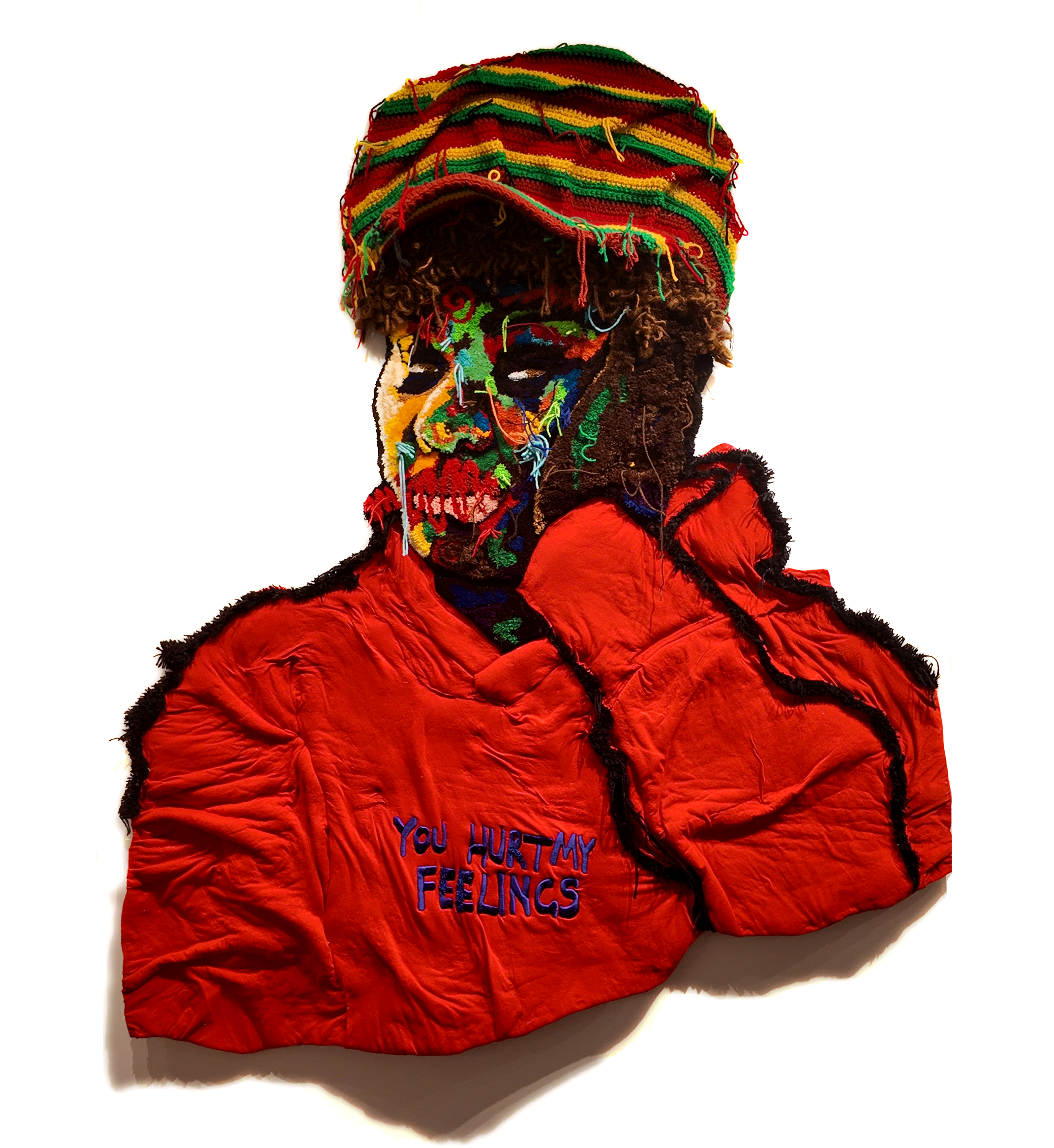 Wool, nylon, acrylic, cotton, glass beads, crotchet, embroidery