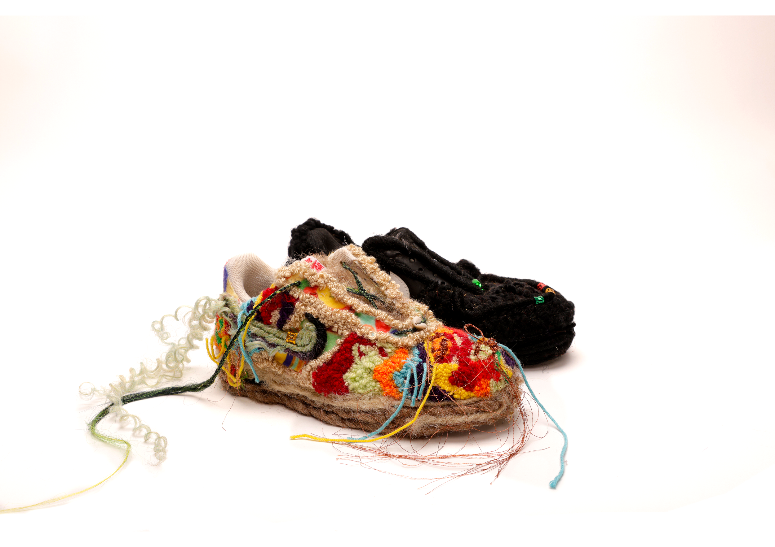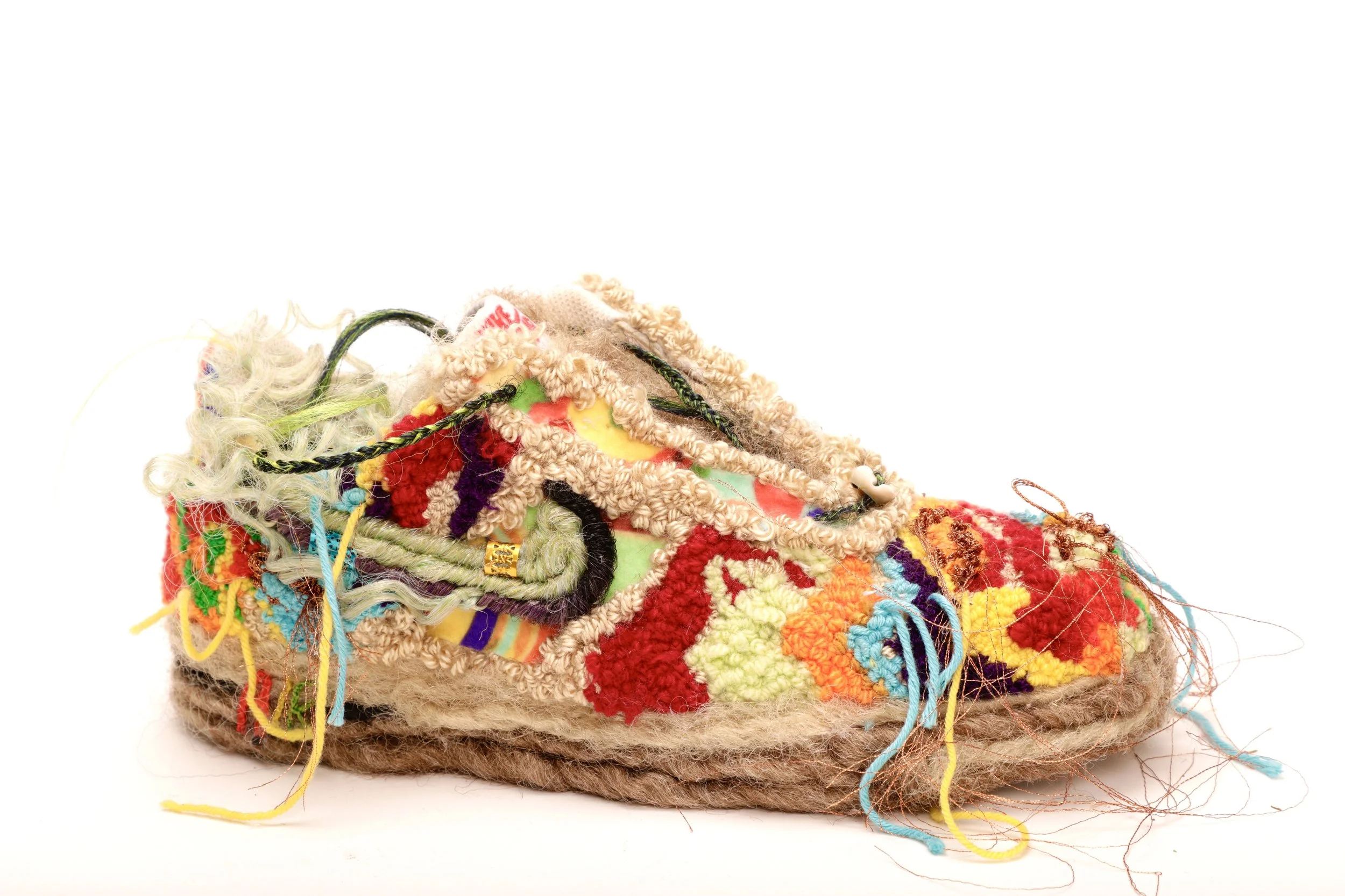 Acrylic Yarn, Synthetic hair, cowrie shells, raspberyy leaf, mango leaf, glass crystals, hand embroidery